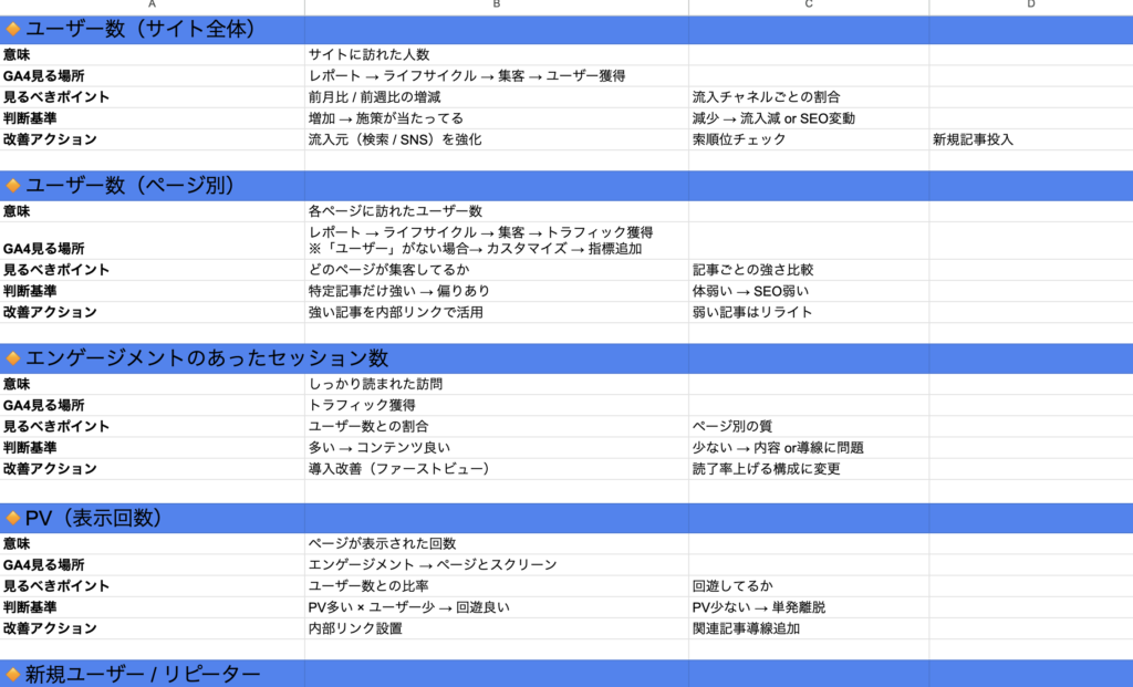 GA4の指標を「意味・目安・改善アクション」までまとめた分析シートです。