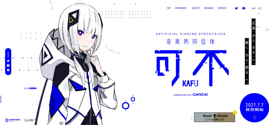 人工歌唱ソフトウェアのサイト。そのイメージ通りサイバーなイメージでまとめられており、スクロールする度に文字や画像が次々と「起動」してゆく。特に、見出しの英字は点滅しながら徐々に現れる。また、カーソルを上に置くことで画像が揺らぐ箇所があり、そのまま切り替えると、切り替え前後に一瞬演出が入る。